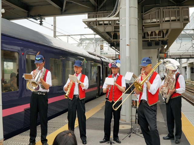 | とちぎまんぷく列車のイベントに招かれ那須塩原駅のホームで演奏しました。 乗客もホームに出て演奏を楽しんでいただきました。 |